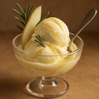 This recipe uses a stracciatella technique for the pear, creating delicate, frozen shards that melt in your mouth, contrasted with the creamy, fragrant rosemary gelato base.